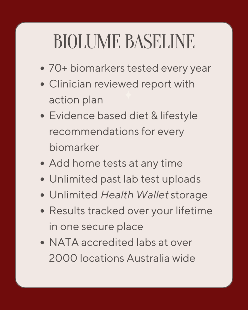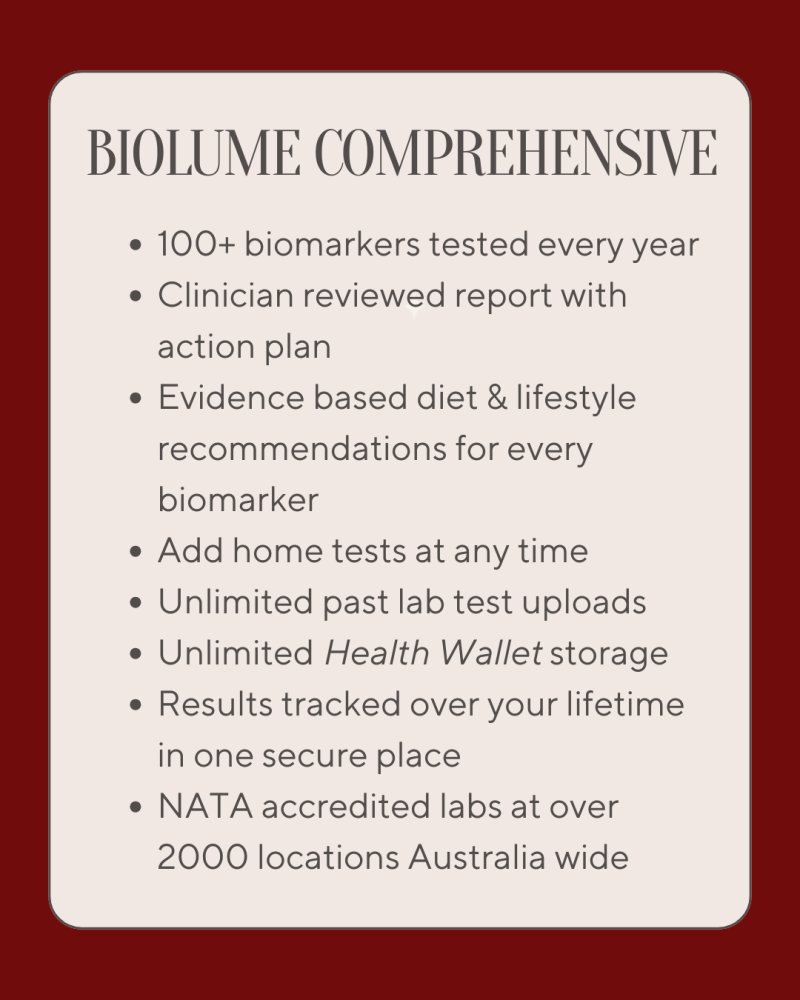 Biolume Health tests over 100 biomarkers across every major body system—giving you functional insight into how your body is performing, adapting, and ageing beneath the surface.